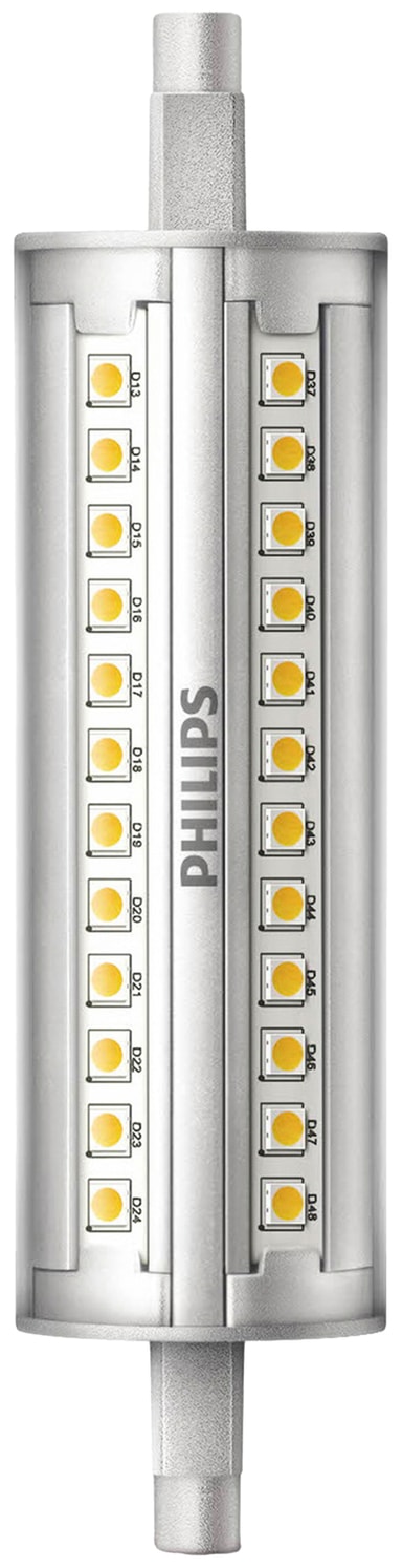 Philips LED pære 14W R7S gir sterkt lys med bare 7 watt strømforbruk. Den lyser med 950 lumen og har et klart, gjennomsiktig design. Perfekt erstatning for halogenlamper.Les mer om produktet