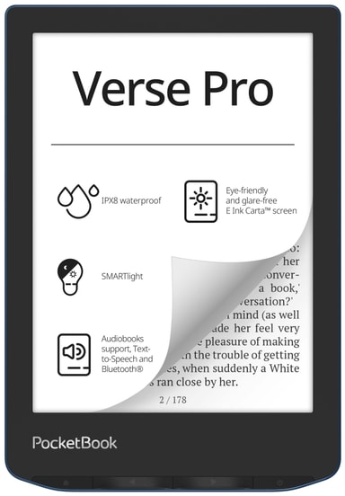 Les alle favoritttitlene dine og lytt til lydbøkene dine med PocketBook Verse Pro eBook lesebrett. Den seks tommer store PocketBook Verse Pro har omfattende lydfunksjoner, beskyttelse mot vann, SMARTlight-skjermkontroll og mye mer.Les mer om produktet