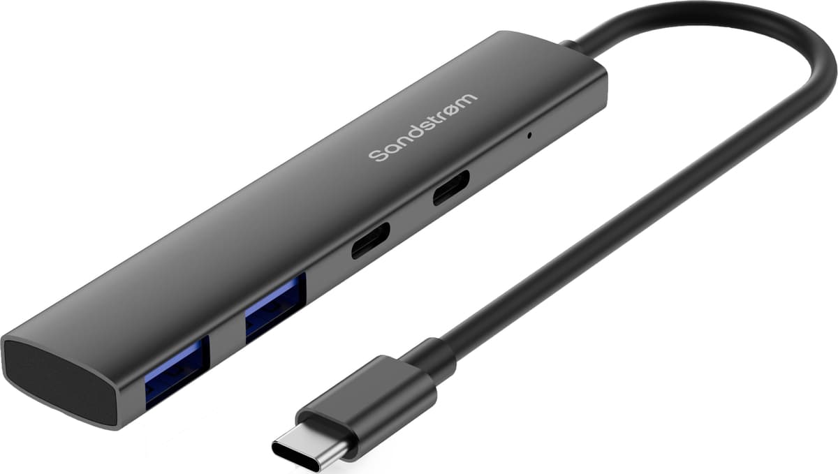Sandstrøm S2C2AHUB26E 4-i-1 USB-C hub tilbyr lynrask 5 Gbps dataoverføring med 2 stk. USB A- og 2 stk. USB C-porter, perfekt for rask fildeling på tvers av enheter som minnepinner, tastaturer og spillkontrollere i elegant romgrått.Les mer om produktet