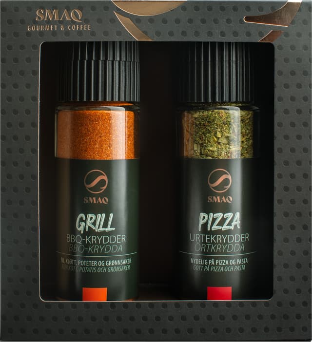 SMAQ gaveeske med krydder 8003 inneholder to krydderbeholdere: en med grillkrydder til kjøtt, poteter og grønnsaker, og en med pizzaurter til pasta, pizza og salater. Den er ideell til hverdagslig matlaging eller som gave.Les mer om produktet