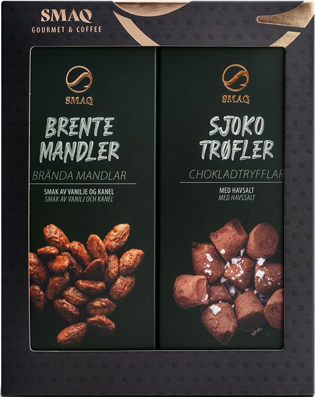 Smaq Sweet Duo sjokoladegaveeske 8009 er laget av førsteklasses ingredienser og er den ideelle gaven til bursdager og høytider. De knasende mandlene med vanilje og sjokoladetrøffel med en klype havsalt vil garantert glede sjokoladeelskere.Les mer om produktet