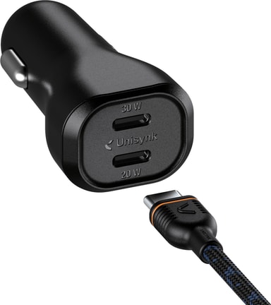 Unisynk 50 W dobbel USB-C billadersett med 50 W gir rask dobbel lading med 30 W og 20 W utganger, universell kompatibilitet og inkluderer en slitesterk, flettet kabel på 1 meter for sømløs strøm på farten.Les mer om produktet