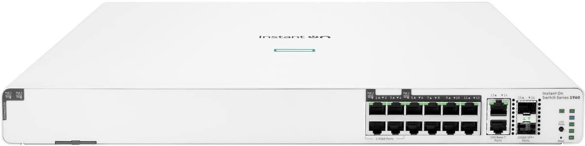 HPE Networking Instant On 1960 nettverksbryter tilbyr smartadministrert Layer 2+-tilkobling med 8x 1G, 4x 2,5G PoE-porter, 2x 10GBase-T, 2x SFP+, stablekompatibelt design, og 480W effekt for sømløs nettverksutvidelse.Les mer om produktet