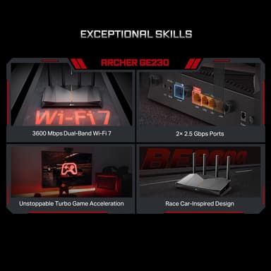 TP-Link Archer GE230 WF7/BE3600 gamingrouter leverer Wi-Fi-hastigheter på opptil 3600 Mbps med doble 2,5G-porter, turboakselerasjon i spill, racerbilinspirert design og TP-Link HomeShield-sikkerhet for en uovertruffen, sikker spillopplevelse.Les mer om produktet