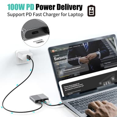 100W PD-lading: Hurtiglading samtidig som video- og dataporter brukes.