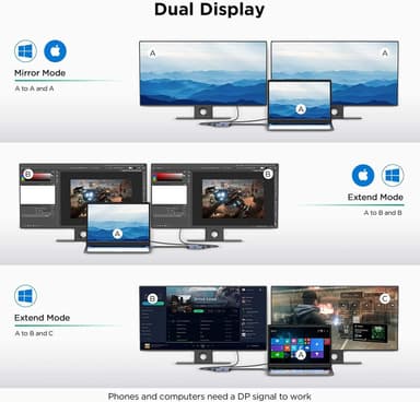Gled deg over krystallklar 4K HDMI-video på 4K-skjermer. Speil dataskjermen til en HDTV, ekstern skjerm eller projektor. Støtter oppløsning opptil 4K 30Hz, 1080p 60Hz (bakoverkompatibel). Kobler du to skjermer til både HDMI og VGA, reduseres oppløsningen til 1080p for begge portene.