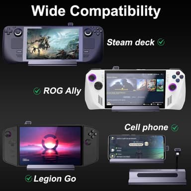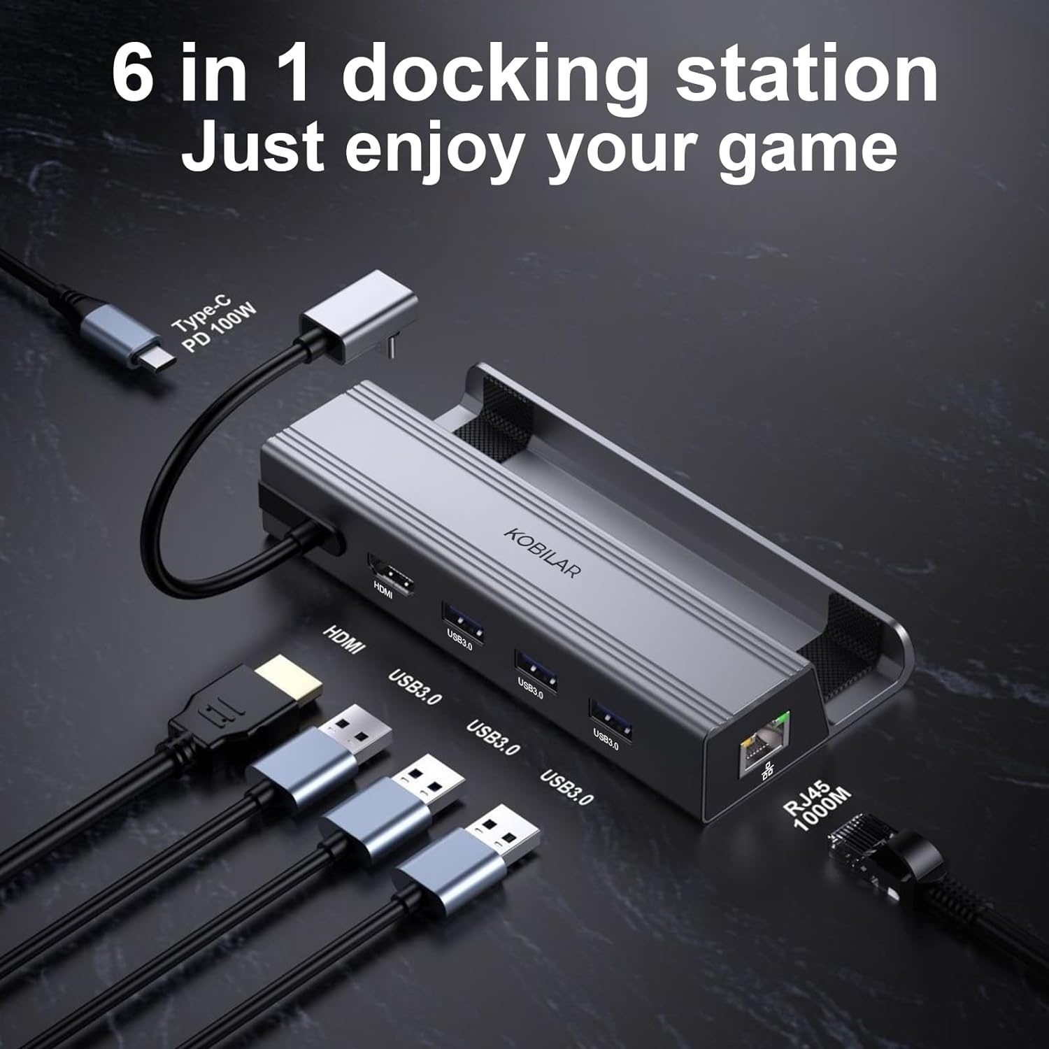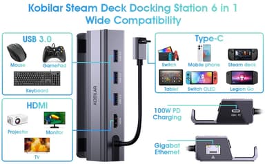 NÖRDIC Steam Deck-dokkingstasjon har 1xHDMI 2.0 (4K60Hz), 1xUSB-C PD 100W, 3xUSB-A 3.0 og 1xRJ45 Gigabit Ethernet. Kompatibel med Steam Deck, ROG Ally, Legion GO, Switch, smarttelefon og bærbar PC.