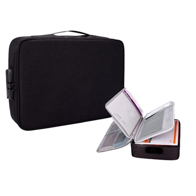 Stor kapasitet på 37x27 cm som kan trekkes opp til en dybde på 12 cm (eller brettes til et flatere format), 3 separate lag, med 4 nettlommer, 12 kortrom, 4 nettrom, stort mapperom og plass til ID-dokumenter. Du får plass med alle dine viktigste dingser som er lagret sikkert takket være kodelåsen.