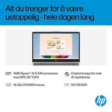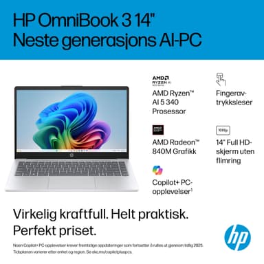 HP OmniBook 3 14" bærbar PC tilbyr kraftig AMD Ryzen™ AI 5-ytelse, samt respektable bilder på Full HD IPS-skjermen. Forbli effektiv og få unnagjort arbeidsoppgavene dine i timesvis takket være det kapable batteriet.Les mer om produktet