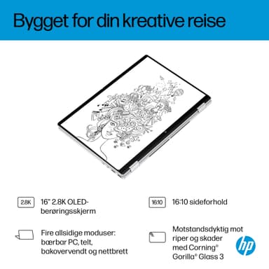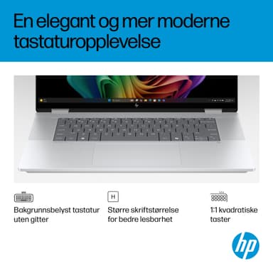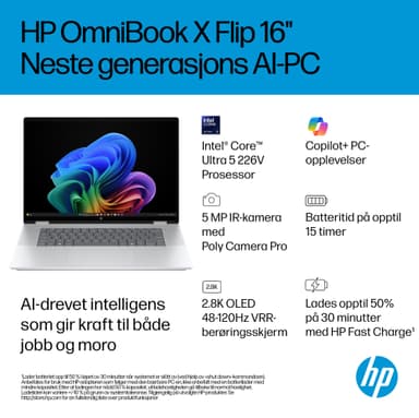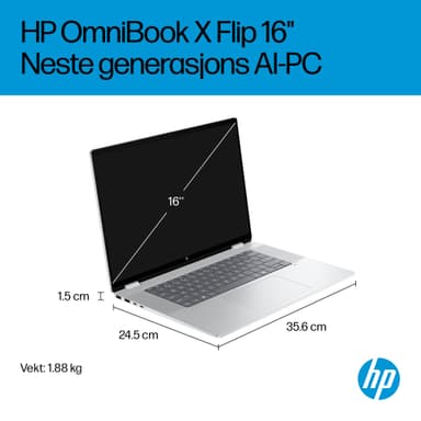 HP OmniBook X Flip 16 Ultra 7-256V/16/1TB/OLED 16" Copilot+ PC forener en KI-drevet Intel Core Ultra 7-prosessor, slående 16" 2,8K OLED-touchskjerm, og anvendelige moduser i et elegant, lettvektig design for kreativitet på farten.Les mer om produktet