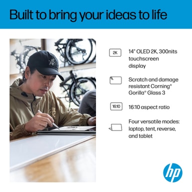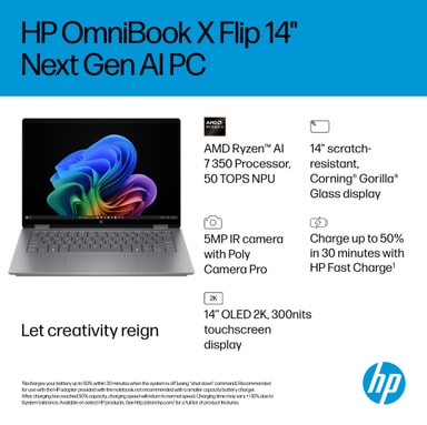 HP OmniBook X Flip AI 7-350/16/512/OLED 14" bærbar PC tilbyr kraftig ytelse med AMD Ryzen™ AI 7 samt respektabel grafikk på 2K IPS-skjermen. Løft ytelsen og hold deg på toppen av oppgavene dine i mange timer.Les mer om produktet