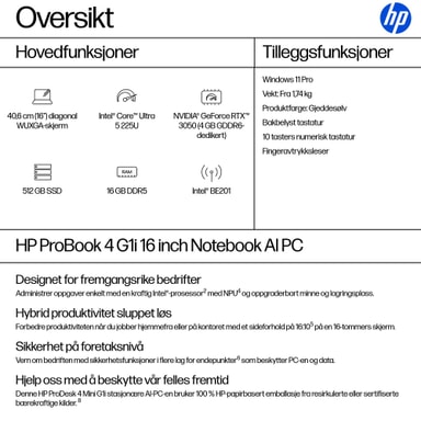 Med en HP ProBook 4 G1i 16-tommers bærbar AI-PC får voksende bedrifter ytelse i kommersiell klasse, endepunktssikkerhet i flere lag[6] og robuste løsninger i en design som er enkel å oppgradere. Denne funksjonsrike PC-en drives av den nyeste Intel-prosessoren[2] med 11 TOPS NPU[4] og lang batteritid, og er klar for langsiktig produktivitet og AI-utforskning.