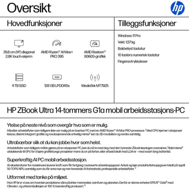 • AMD Ryzen™ AI Max+ PRO 395 (opptil 5,1 GHz toppfrekvens, 64 MB L3 cache, 16 kjerner, 32 tråder)