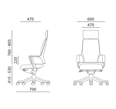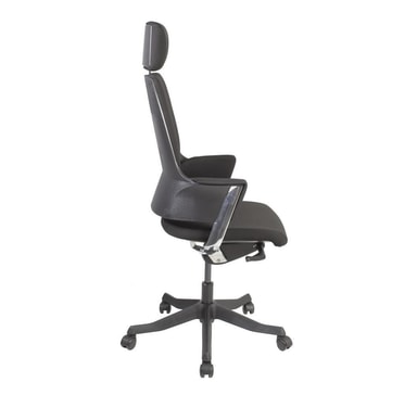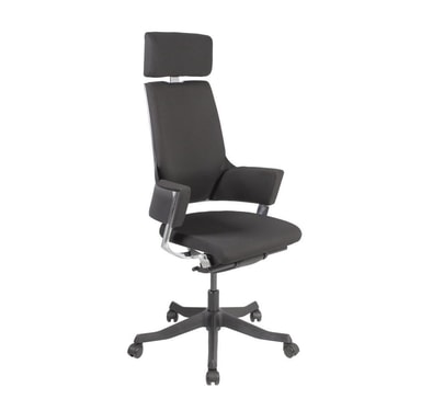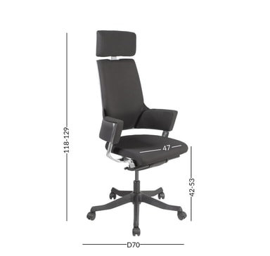 Arbeidsstol DELPHI svart. DELPHI-stolen er solid og verdig, uten at det går på bekostning av komfort og ergonomi. Stolens rygg og armlener danner en kompakt enhet som gir en følelse av trygghet og tilstrekkelig støtte. Det ytre skallet på ryggstøtten er støpt av sort plast (100 % PP resirkulerbar) som kompletteres av pressstøpte aluminiumsdeler i en glatt polert finish på sidene av stolen. Sete og rygg er trukket og dekket med slitesterkt polyesterstoff, Martindale verdi 50.000. Stolen har en synkronisert mekanisme med tiltspenningskontroll og en trinnløs tilbakelenningslås, som tillater låsing av ryggstøtten i enhver valgt posisjon. Setehøyden kan justeres med gassstøtdemperen. Høyden på hodestøtten er justerbar. Stolens 5-polede base er laget av sort plast. Stolen har gulvbesparende autobrems nylonhjul. De totale målene på stolen er 70x70xH117,5-133,5cm. Setebredde 47cm, setedybde 47cm, setehøyde 41,5-53cm. Vektgrense 120 kg.