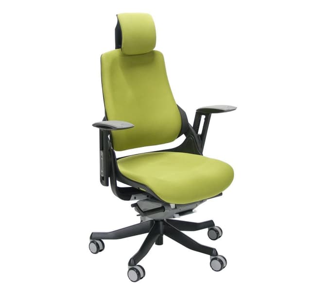 Arbeidsstol WAU olivengrønn. WAU-stolen kombinerer utmerket ergonomi og sporty stil, og tilbyr den beste støtten og ytelsen for en hel arbeidsdag. Det ytre skallet på stolen er laget av sort plast og de indre delene av rammen er støpt av grå plast (100 % PP resirkulerbar). Ryggrammen er fiberforsterket. Stolens polstrede sete og rygg er dekket med olivengrønt polyesterstoff, Martindale verdi 50 000. Stolen har en synkronisert mekanisme med justerbar tiltspenning, og tiltlåskontroll. Pneumatisk setehøydejustering. Høyden på nakkestøtten og ryggstøtten er justerbar. Stolen har justerbar korsryggstøtte. Armlensdekslene er laget av grå elastomer termoplast. Høyden og rotasjonsvinkelen til armlenene er justerbare. Stolens 5-pinne base er laget av støpt aluminiumslegering og ferdig med svart epoxy pulverlakk. Stolen har 60 mm gulvbesparende nylonhjul. De totale målene på stolen er 70x70xH112-129cm. Setebredde 47cm, setedybde 49cm, setehøyde 40-48cm. Vektgrense 120 kg.