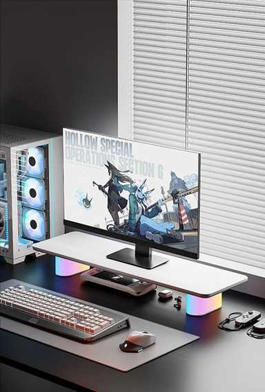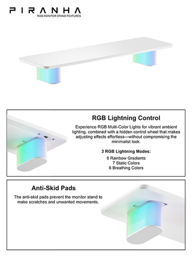 Piranha RGB skjermstativ er elegant og moderne, og forbedrer komforten med ergonomisk skjermheving og tilpassbar belysning. Blant funksjonene er RGB-moduser som kan tilpasses, et skjult kontrollhjul, sklisikre puter og enkel montering.Les mer om produktet