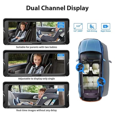6,8 tommers babymonitor for bil, 360 graders rotasjon, dobbeltkamera, 8 LED-lys, fullfarge-HD, infrarødt nattsynskamera【Forbedret sikkerhet】6,8 tommers babymonitor for bil med dobbeltkamera reduserer behovet for at foreldre må snu hodet mens de kjøreLes mer om produktet