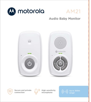 Motorola AM21 er en lydmonitor som bruker DECT-teknologi for å holde deg tilkoblet barnet ditt, uten å forstyrre Wi-Fi®-frekvensen. Vandre rundt i huset uten å miste forbindelsen, med en rekkevidde på opptil 300m *, og få advarsler når du er utenfor rekkevidde eller batteriet er lavt. Gå aldri glipp av en lyd fra barnet ditt takket være mikrofonen med høy følsomhet, slik at du vet når barnet ditt er våkent, pluss at du kan kontrollere volumnivåene fra foreldreenheten eller mobilenheten.  * Når det er en klar siktlinje mellom foreldreenheten og babyenheten. Enhver hindring mellom foreldre og babyenheter vil redusere rekkevidden betydelig. Med foreldreenhet og babyenhet innendørs er den typiske rekkevidden opptil 50 meter. Pakken inneholder en babyenhet, en foreldreenhet, to strømadaptere og en hurtigstartguide.