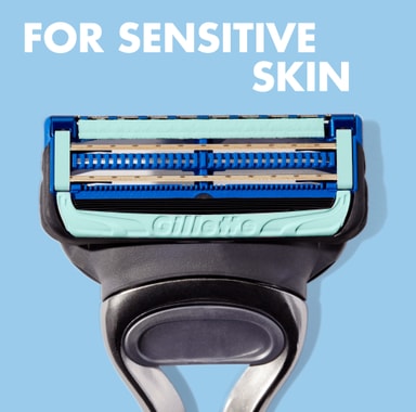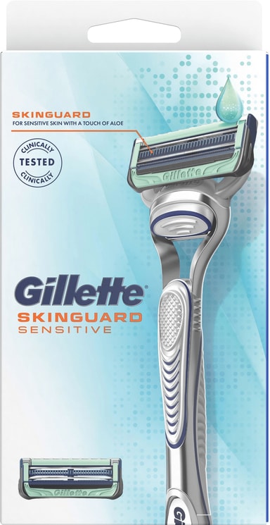 SkinGuard Sensitive barberhøvel, med et snev av aloe, er klinisk bevist å være egnet for sensitiv hud samtidig som den gir deg den pålitelige barberingen du forventer av Gillette.
