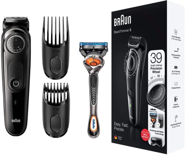 Andre funksjoner: Skarpere, raskere og mer effektiv enn alle tidligere generasjoner av Braun skjeggtrimmere Presisjonshjul for 39 lengdejusteringer i trinn på 0,5 mm for en jevn trimopplevelse Livstid med skarpe blader for jevn trimming av skjegg og hår Barber presise linjer og konturer på halsen og kinnene med hovedskjeggtrimmehodet Tysk teknologi og ergonomisk form for opptil 80 minutter med trådløs trimming