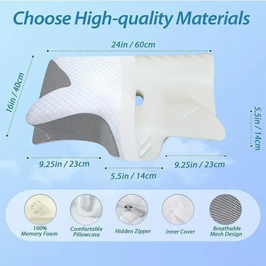 Premium Memory Foam: Laget med minneskum med høy tetthet, former denne puten seg etter kroppens konturer og gir personlig støtte og trykkavlastning. De langsomme rebound-egenskapene til skummet gjør at den forsiktig holder hodet og nakken, og fremmer avslapning og avslappende søvn.