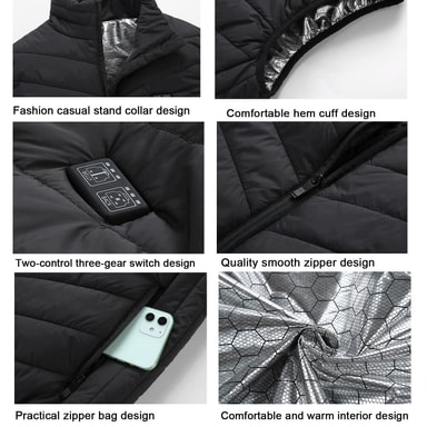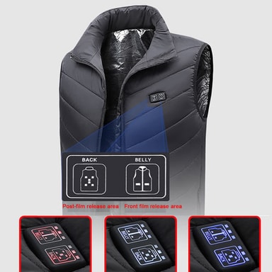 Varmer overkroppen: En oppvarmet vest som er myk og pustende og som varmer kropp, midje, mage og nakke ekstra mye når det er kaldt. Ideell for utendørsaktiviteter som camping, jakt, fiske, skigåing, fotturer eller for tilskuere som vil sitte på tribunen i den kalde årstiden. Kan brukes som yttertøy eller som et behagelig varmt underplagg.
