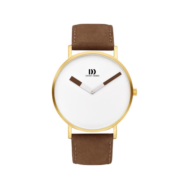 Denne enkle danske design klokke har en gull farget rustfritt stålkasse med en ren hvit urtavle, mineral krystallglas og en brun lær rem.