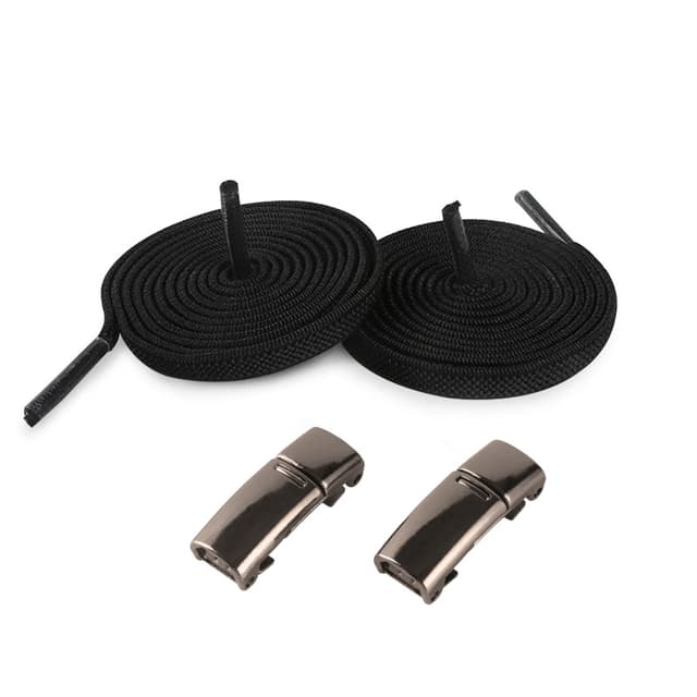 Disse skolissene trenger ikke å knyttes. De er elastiske og holdes sammen av en metallspenne. Bare sett dem på plass, klipp til riktig lengde og fest magnetlåsen. Da er det bare å ta av og på seg skoene uten å måtte binde skuta.