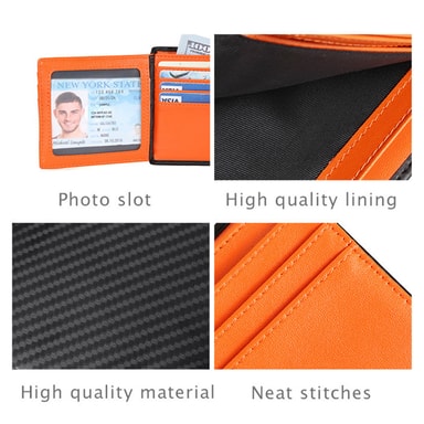 Denne lommeboken har seddelklips, vekselom, dokumentrom og flere kortspor. RFID-funksjonen blokkerer effektivt RFID-lesere, og hindrer andre i å skanne betalingskortene dine og dermed holde pengene dine trygge.