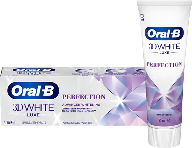 Oral-B 3DWhite Luxe Perfect tannkrem fjerner opptil 100 % misfarging etter bare tre dager med jevnlig bruk to ganger om dagen. Den beskytter emaljen og bleker tennene dine skånsomt, samtidig som den forhindrer ytterligere misfarging. Tuben inneholder 75 ml tannkrem.