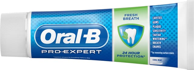 Tannkremen Oral-B Pro-Expert Fresh Breath har en unik kombinasjon av fluor og andre aktive ingredienser som beskytter tennene dine mot plakk, hull og misfarging i 24 timer. Denne tannkremen har en smak av kjølig mint for langvarig friskhet og god ånde.
