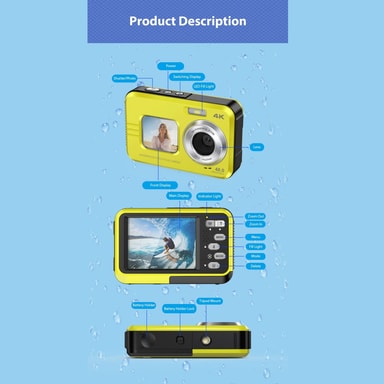 3,5m/11FT undervannskamera: Det vanntette designet gjør at dette undervannskameraet fungerer ved dykking ned til 3,5 meter under vann, perfekt for snorkling, badeland eller andre vanneventyr, inkludert svømming, surfing, besøk på strand og bading (OBS: Sørg for at batteridekselet er forsvarlig låst før du tar kameraet under vann.)