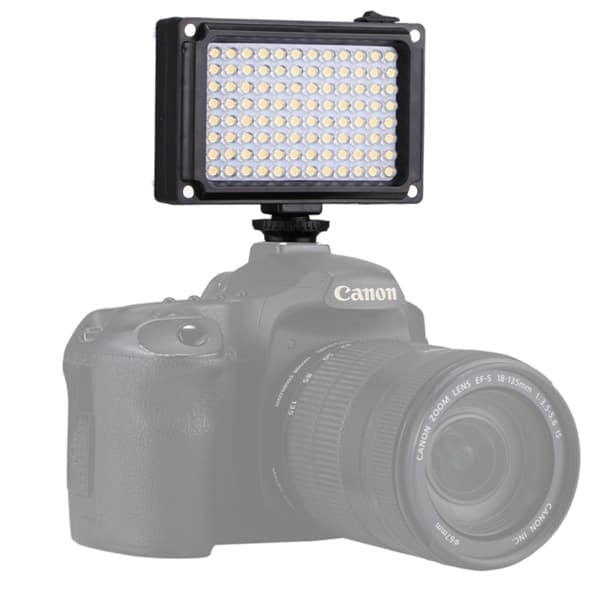 Profesjonell LED-belysning til videokameraer. Belysningen er liten og lett å ta med i lommen. Kan også brukes ved telefonfotografering eller DSLR speilfri kamerafotografering. Veldig effektivt og energisparende lys med lavt strømforbruk. Ta med en ekstern strømbryter for å beholde samme lysstyrke hele tiden. Har støtte for litiumbatteri-inngang, men kan også brukes med 4 stk AA-batterier (batterier medfølger ikke). Har støtte for ekstern strøminnmating (micro 5 pin port) som passer ved langvarig bruk. Belysningen har 96 stk innebygde høykvalitative LED-dioder. Man kan rotere switchen for å justere lysstyrken uten filterplater, passer for ulike typer fotograferingsatmosfærer. Belysningen kan festes i kameraets blitzsko, i en profesjonell lysramme eller tripod-stativ. Har en ¼- skrue (hunn) som passer til DSLR som Canon, Nikon, Sony og andre videokameraer. Dessuten kan den brukes på et ¼-s stativ for å hjelpe iPhone-eieren med å ta fantastiske videoer og foto. Spesifikasjon Materiale: ABS Fargetemperatur: 5500K LED-dioder: 96 stk Strømforsyning: 4 x AA-batteri eller 1 x BP-4L batteri (medfølger ikke) Inngangsspenning: 5V Størrelse: 10,5 x 8,8 x 3,5 cm Vekt: 139 gram Pakkens innhold: 1 stk beskyttelsespose 1 stk LED-videolys 1 stk blitzsko feste 2 stk filterplater