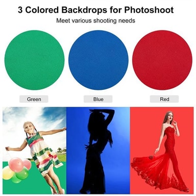 Disse stativene lar deg få en bakgrunn på 3 meter i bredden og opptil 2 meter i høyden (høydejusterbar). Stativet har også tre forskjellige fargede bakgrunner. Bakgrunnen er 2,9 x 3m. I tillegg til stativer og baktepper, er også klemmer inkludert, slik at du kan feste bakgrunnen til stativet.