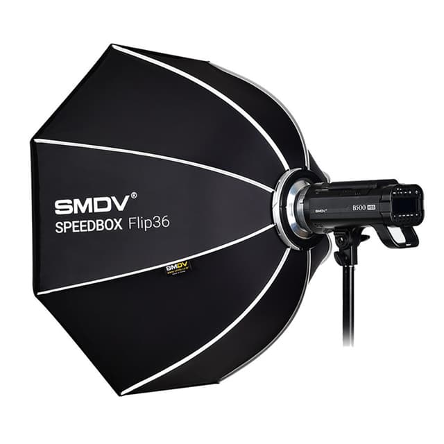 SMDV Speedbox Flip-36 er en åttekantet softbox som er veldig rask å sette opp. Flip-36 har en diameter på 90 centimeter og har et praktisk foldesystem. Dette gir deg muligheten til å slå den opp og brette den sammen på et blunk. Den kommer i en hendig bæreveske.