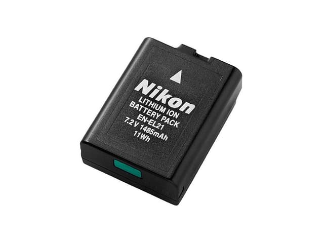 Nikon Oppladbart Batteri EN-EL21. Et oppladbart litiumionbatteri med høy kapasitet til bruk i bestemte Nikon 1-kameraer. Det kan lades opp med en kompatibel batterilader.