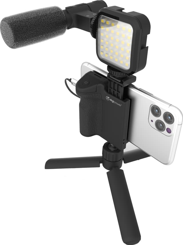 Digipower Follow Me vlogging tilbehørssett vil dekke alle dine kreative behov på dine vlogging-eventyr. Den leveres med et grep til smarttelefon i en sømløs gummifinish for å sikre stabilitet, et bodstativ med universalfeste, og du kan også bruke den innebygde trådløse fjernkontrollen i opptil 9 meter avstand. Den universelle mikrofonen kan brukes med hvilken som helst smarttelefon eller kamera, og du trenger ikke bekymre deg for belysning med lysets 36 sterke lysdioder.