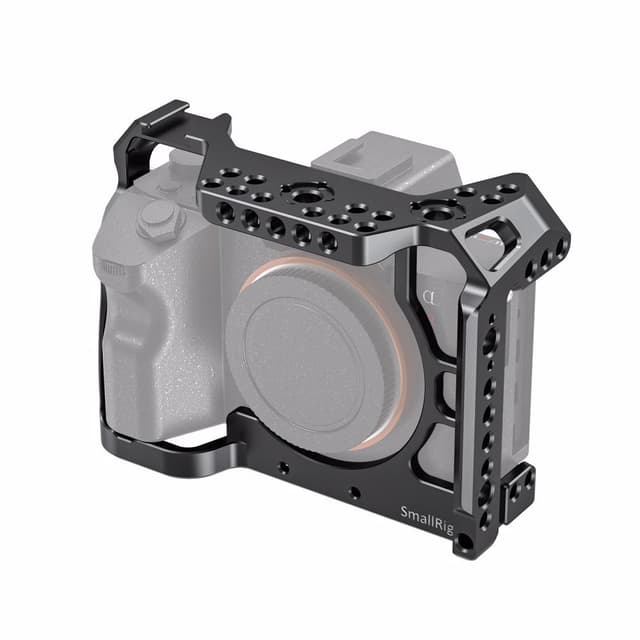 SmallRig Cage til Sony A7R IV CCS2416 er et fullstendig kameratilpasset bur. Kameraet er festet med en 1/4 skrue i bunnen og en M2.5 skrue på siden. Den leveres med flere 1/4 '' - 20 og 3/8 '' - 16 gjengede hull, ARRI-lokaliseringshull, en innebygd NATO-skinne og en Cold Shoe, som gjør det mulig å montere forskjellige tilbehør med blitsskofeste.