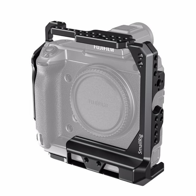 SmallRig Cage for Fujifilm GFX 100 CCF2370 er designet for å gi beskyttelse og monteringsgjenger for tilbehør som skjerm, mikrofon og lys. Buret festes til bunnen av kameraet og har en m2.5 skrue som et andre festepunkt på høyre side for å forhindre at kameraet vrir seg. Den har flere 1/4 ”-20, 3/8” -16 og Arri lokaliseringshull for tilbehørsfeste, for eksempel Cold Shoe 2260, Top Handle 2165 og Monitor Mount 2294.