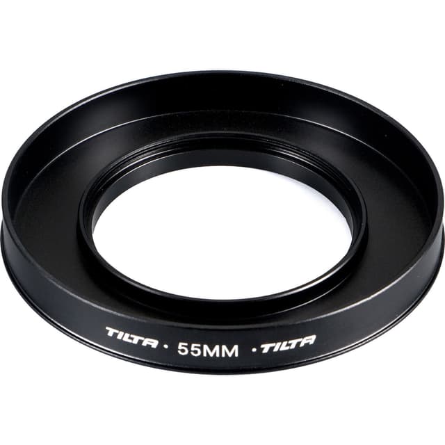 Denne Tilta 55mm adapterringen lar deg montere Tilta Mini Clamp-On Matte Box på objektiver som har en 55mm frontdiameter. Adapterringen skrues på fronten av linsen, og matte boksen klemmes deretter på adapterringen. Tommelfingerhjulet på siden av matte boksen brukes til å feste matte boksen ordentlig til adapterringen.