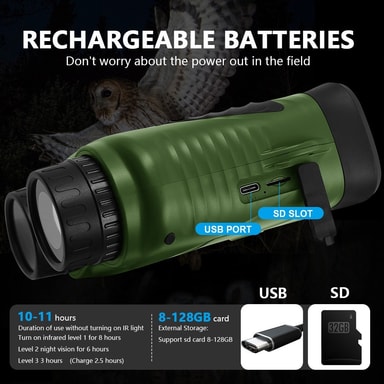 Brukervennlig design: Denne nattsynskikkerten er designet for enkel bruk, og har et brukervennlig grensesnitt med bakgrunnsbelyste silikonknapper som er enkle å betjene selv i fullstendig mørke. En-knapps bryteren gir rask og enkel aktivering, og sikrer at du aldri går glipp av et avgjørende øyeblikk. Kikkerten er også stativmonterbar, noe som gir stabilitet for lengre visningsøkter. Med 10 språkalternativer henvender denne kikkerten seg til et globalt publikum. Det langvarige 2600mAh batteriet tilbyr opptil 8 timers kontinuerlig bruk på den laveste infrarøde innstillingen og opptil 11 dagers standby-tid, noe som sikrer pålitelig ytelse under lengre utendørsaktiviteter. Kombinasjonen av intuitive kontroller, allsidige monteringsalternativer og lang batterilevetid gjør denne kikkerten til et praktisk og praktisk verktøy for ethvert nattlig eventyr eller overvåkingsoppgave.