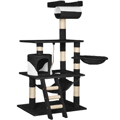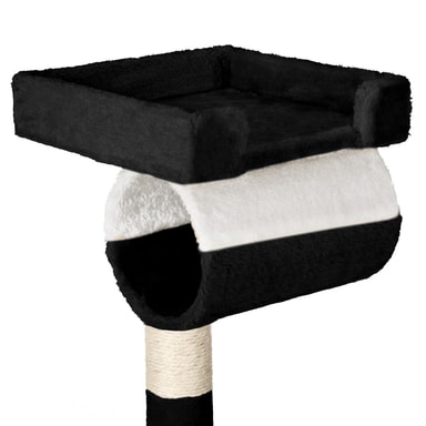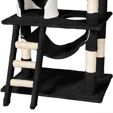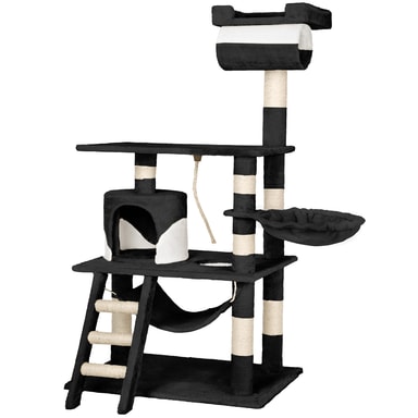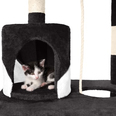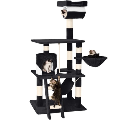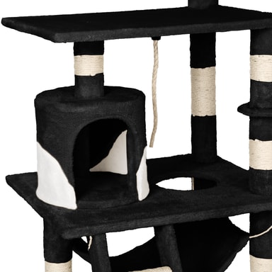 Katten din vil elske dette vakre og praktiske kattetreet fra tectake. Kattetreet tilbyr individuelle og optimale måter å leke, kvesse klør eller trekke seg tilbake til et privat sted. Kattungen din kan nå hulen sin på første nivå via trappene. Rett ved siden av hulen er det en flott lekesnor, ideell for å leke. En koselig hengekøye er ideell for å slappe av og kan nås ved å slippe ned gjennom hullet i første etasje. Den runde sengen som er satt litt høyere er det perfekte stedet å henge og ta en kattelur. Deretter kommer den store plattformen i andre etasje hvor kattene dine virkelig kan strekke seg ut og slappe av. Helt på toppen er det et utsiktsdekk, satt til 141 cm, perfekt for kjæledyret ditt å slappe av og undersøke hele rommet, og tilfredsstille deres naturlige nysgjerrighet. Festet til bunnen av denne plattformen er en tunnel, som katten din vil elske å prøve å klatre inn i for å gjemme seg. Katten din kan slipe klørne på de slitesterke blandede skrapestolpene som består av en plysj-sisal-kombinasjon. Alt i alt er dette et veldig omfattende, stort kattetre som etterlater ingen katteønsker uoppfylt og oppmuntrer dem til å uttrykke sin naturlige oppførsel.