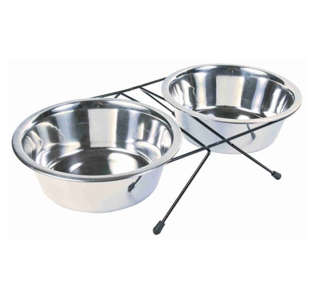 Skålsett rustfri 2 skåler i rustfritt stål med stativ pulverlakkert metallstativ, sort sklisikre på grunn av erstatningsskåler med gummiføtter: vare 24840–24844