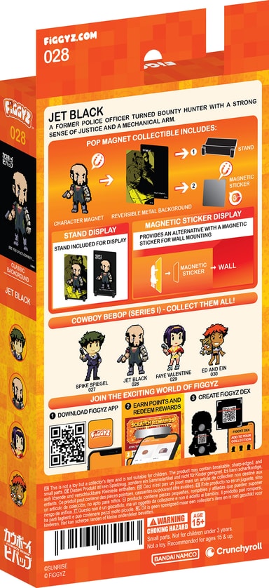 First 4 Figures Figgyz Cowboy Bebop Magnet actionfigur har en vendbar bakplate i metall som gir to visningsalternativer, en figur i pikselkunststil, magnetisk 3D-pop-out-effekt, en display-base og et magnetisk klistremerke.Les mer om produktet