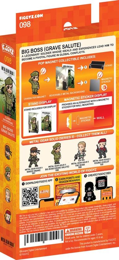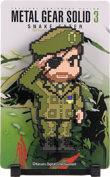First 4 Figures Figgyz Metal Gear Solid 3 Pop Magnet actionfigur har en reversibel bakplate av metall for to visningsmuligheter, en pixel-stilart karakter, 3D magnetisk pop-out- effekt, displaybase, og et magnetisk klistremerke.Les mer om produktet