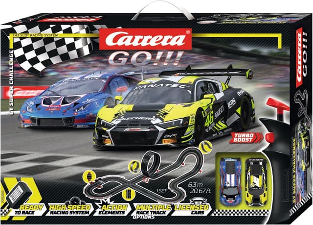 Analog bilbane i 1:43 skala med en Audi R8 LMS GT3 evo II kjørt av Moto GP legenden Valentino Rossi og en Lamborghini Huracan GT3 No.8. Banelengde på 6.3m med kryssende veibaner, rundeteller, loop, flere svinger, der den ene er superbratt! Håndkontrollerne har trinnløs gass samt en turboknapp for ekstra hastighet ved forbikjøringer.