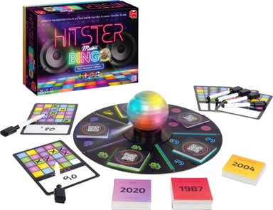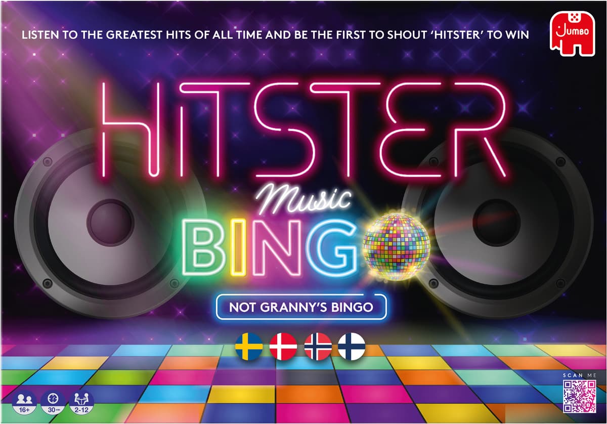 Jumbo Hitster Nordic Bingo festspill er et spill der du kan snurre en diskokule for å velge en kategori, scanne et songkort, spill av sangen, og deretter kan du gjette tiåret, artist, år, eller sangtype, og krysse av på bingokortet ditt for å vinne.Les mer om produktet