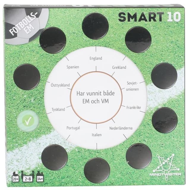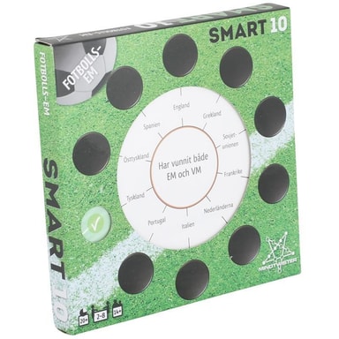 Innehåller 50 dubbelsidiga kort med 100 nya frågor och 1000 nya svar. Temat är fotbolls-EM för herrar och utöver spelare, lag, UEFA och historiska resultat handlar frågorna om kvalet inför EM 2020 och värdstäderna sommaren 2020. Byt ut frågekorten i Smartboxen mot två förpackningar temafrågor eller blanda dessa temafrågor med hälften av de ursprungliga frågorna.