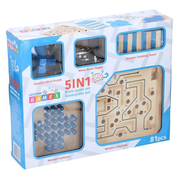 Jenga, Solitaire, Ball Maze, Trepuslespill og metallkroker.