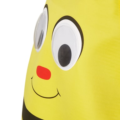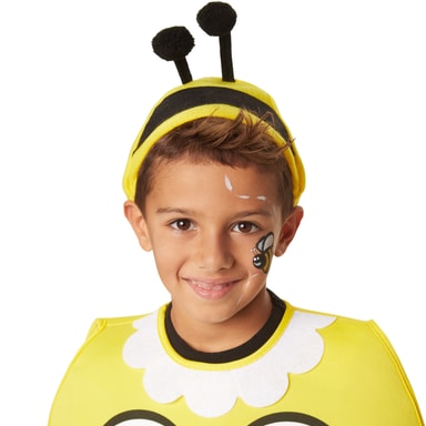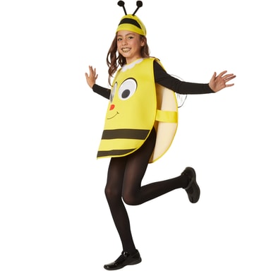 Kostymet Cartoon-bie til jenter og gutter består av en gul poncho med borrelås bak. På fronten er det påsydd store plastøyne og påsatt nese, munn og svarte striper. Krage med hvit, rund kant. På baksiden har kostymet vinger av tyll. Filthatten har en svart stripe og to følehorn. Materiale: 100 % polyester.